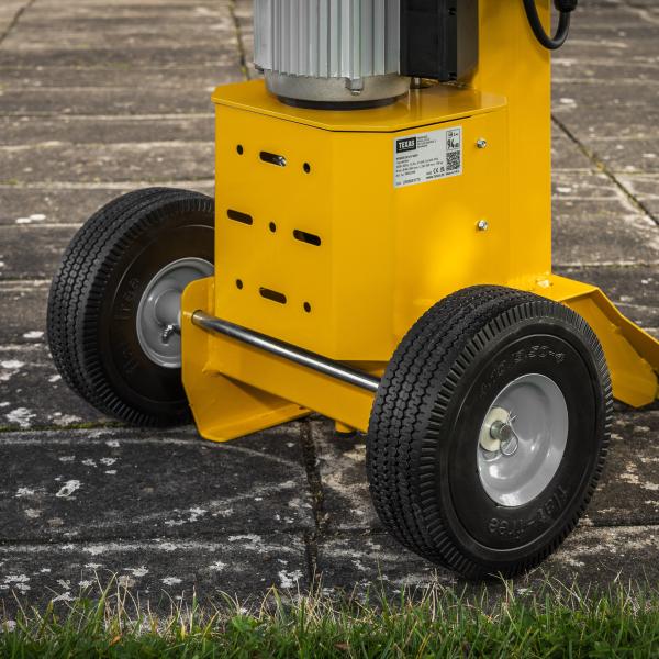 Med en vægt på 111 kg er brændekløveren meget solid og robust at arbejde med, men så har den også nogle ekstra store punkterfri hjul, som letter transporten. Og så er der også et lille kløvebord på hver side af brændekløveren.