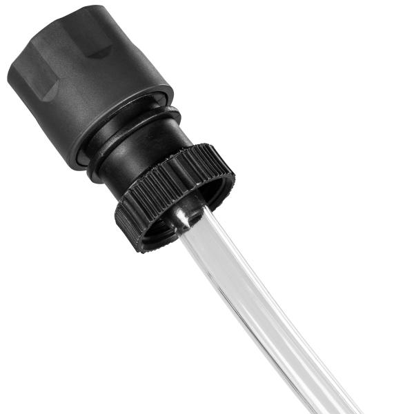 Montér slangen på en vandhane eller sæt den blot i en spand med vand, en regnvandstønde mv. - og et filter i slangens ende forhindrer snavs i at blive suget ind.