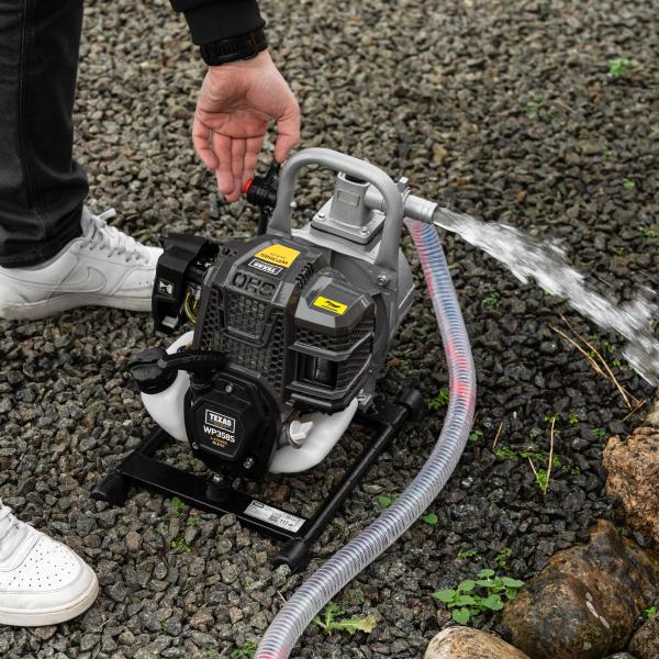 Kompakt og praktisk vandpumpe med stærk luftkølet 4-taktsmotor på 35,8 cc. Pumpen har et integreret bærehåndtag og gummifødder.